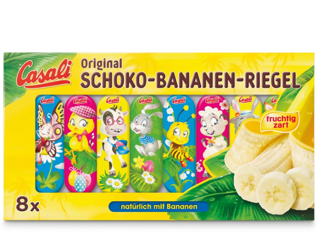 Bomboane spuma cu pulpa de banana inmuiata in ciocolata (29%) · Ingrediente: zahar, sirop de glucoza si fructoza, masa de cacao, unt de cacao, pulpa de banana (8% în umplutură), stabilizator: sorbitol, gelatină, gelifiant: agar, regulator de aciditate: acid citric, arome, emulgator: lecitină de soia , colorant: curcumină, amidon de grâu . Poate contine urme de lapte, ingrediente din lapte si nuci. A se pastra la temperatura camerei si uscat. Perioada de valabilitate minimă până la: vezi ambalaj.