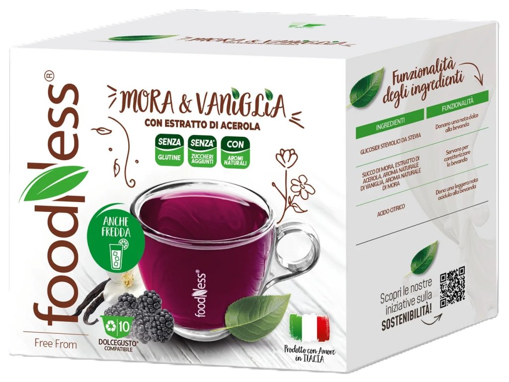 Răsfață-te cu un moment perfect de relaxare cu o băutură care combină gustul delicios cu grija pentru corpul tău. Capsulele Foodness Mora & Vaniglia aduc o combinație armonioasă de mure zemoase și vanilie delicată, îmbogățită cu prețiosul extract de acerola.