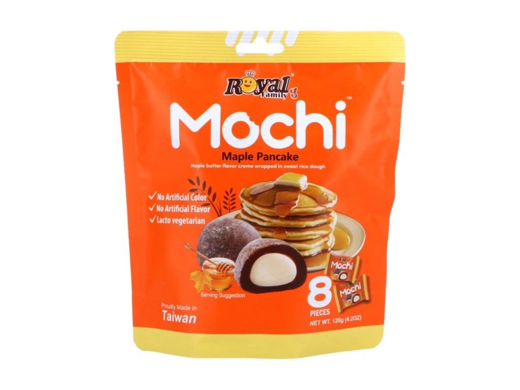Bucură-te de o fuziune unică între tradiția asiatică și micul dejun nord-american sub formă de mochi de la marca taiwaneză Royal Family. Acest desert original ascunde o cremă delicioasă cu aromă de unt de arțar într-un aluat de orez moale și gumos, care amintește de clătitele dulci. Marele avantaj este că produsul nu conține coloranți sau arome artificiale și este potrivit și pentru lacto-vegetarieni. Pachetul conține 8 bucăți ambalate individual pentru o experiență dulce perfectă.