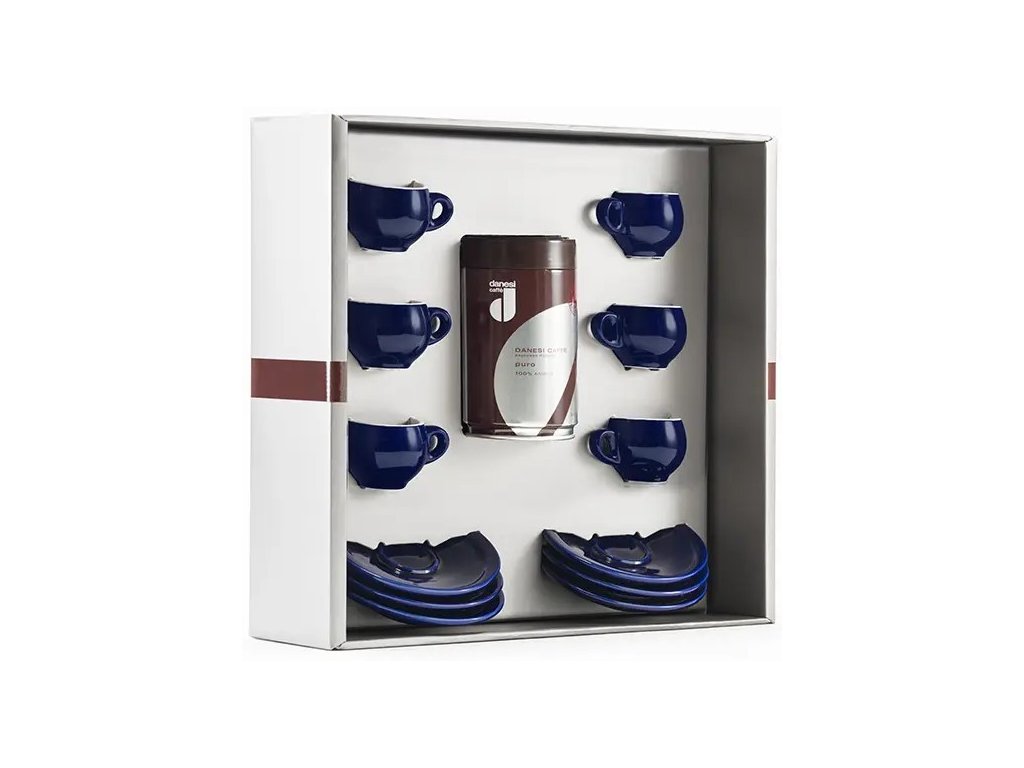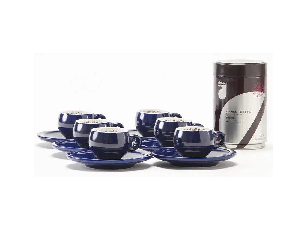 Pachet cadou Danesi La Forma Sprint - Dark's Cassette Kava 250g + 6 cești de espresso și 6 farfurioare - albastru