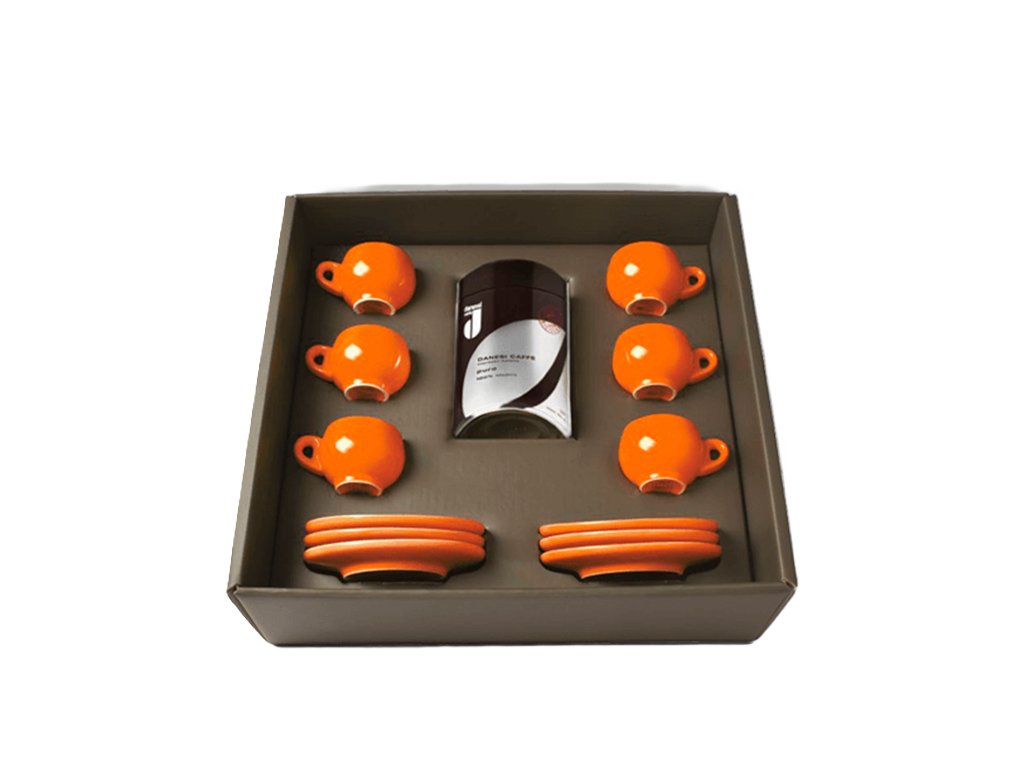 Pachet Cadou Danesi La Forma Sprint - Dark's Cassette Kava 250g + 6 cesti espresso si 6 farfurioare - portocaliu