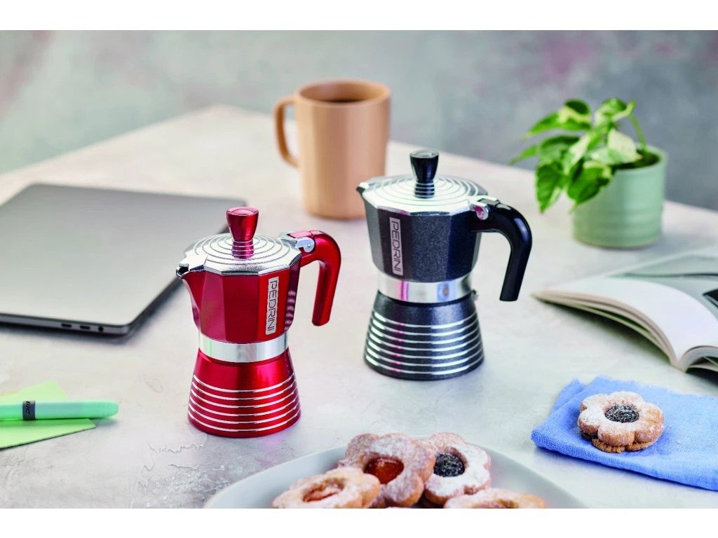 Infinity de la marca italiană Pedrini este o cafetieră moka elegantă, fabricată din aluminiu alimentar premium . Suprafața sa este decorată cu o glazură strălucitoare rezistentă la căldură , care protejează materialul de pătare și pierderea calității chiar și în cazul utilizării pe termen lung. Modelele circulare elegante de pe capac și fund conferă cafetierei o notă care vă va uimi nu numai pe dumneavoastră, ci și pe fiecare vizitator.