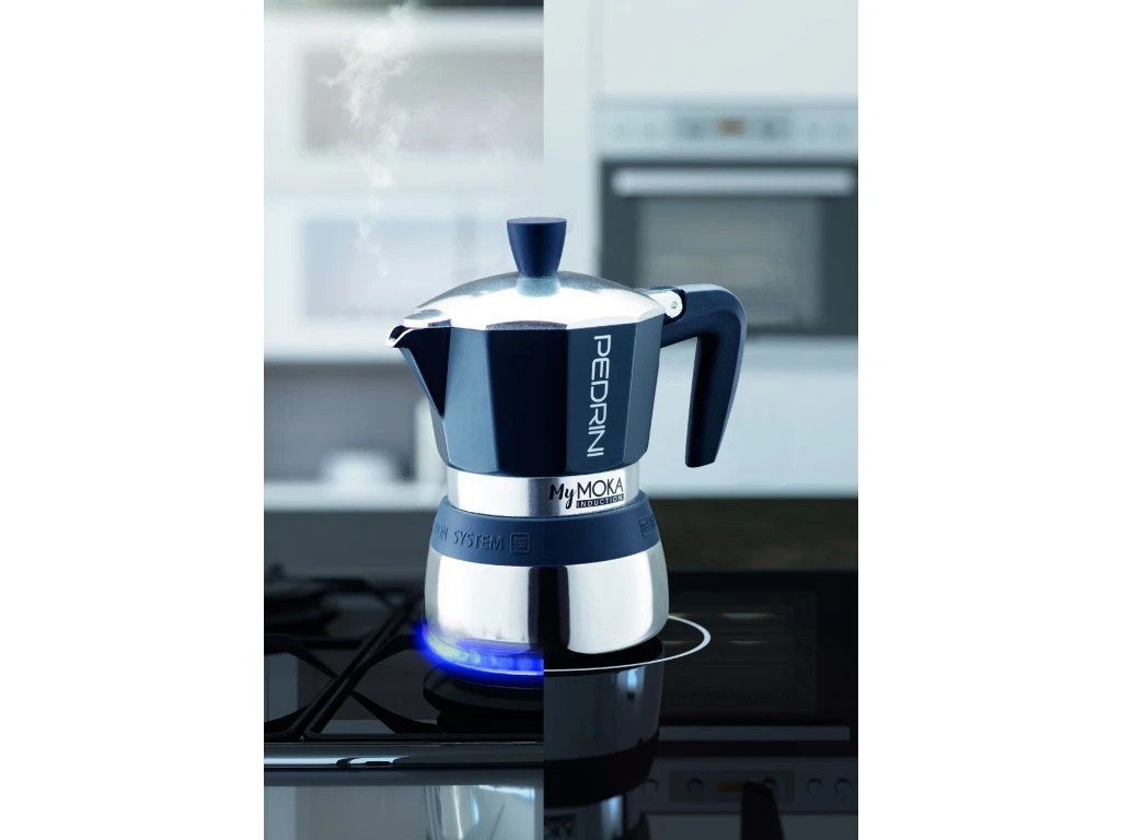 Pedrini MyMoka Induction Blue este o oală moka cu inducție compatibilă cu toate metodele de încălzire. Este echipată cu un recipient cu fund dublu , unde stratul exterior este fabricat din oțel inoxidabil INOX 18/10 lustruit, care asigură compatibilitatea cu inducția , iar stratul interior este fabricat din aluminiu alimentar , care acumulează mai bine patina și nu afectează gustul cafelei preparate. Designul patentat cu dublu strat asigură prepararea optimă a cafelei italiene tradiționale chiar și pe inducție. Există o supapă de siguranță și un mâner rezistent la căldură pentru confort și siguranță maximă în timpul utilizării.