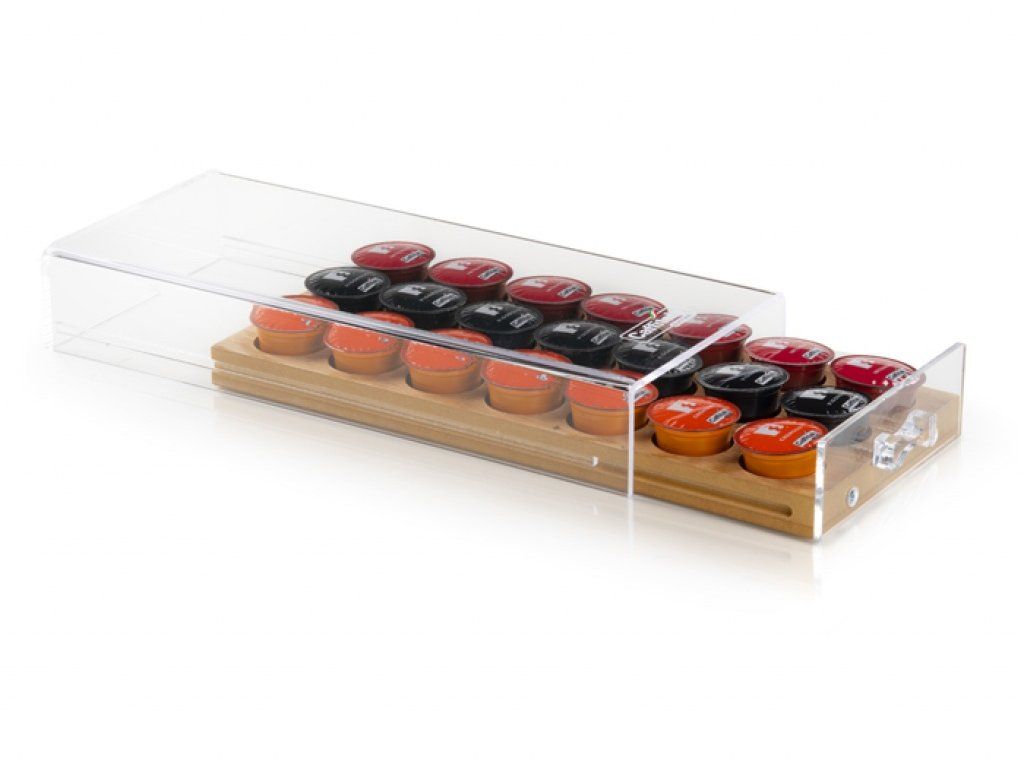 Elegant suport capsule realizate din materiale de calitate (crystal-lux si lemn). Ideal pentru utilizare sub Automat de cafea : vă permite să alegeți amestecul preferat cu un simplu gest. Poate fi folosit pe Tchibo Cafissoimo și Capsule Caffitaly